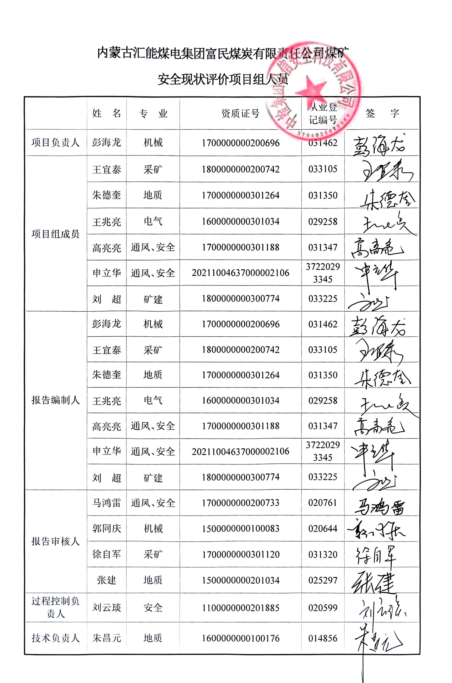 參與安全評價工作的注冊安全工程師: 彭海龍 高亮亮 申立華 朱德奎 王宜泰 | |||||||