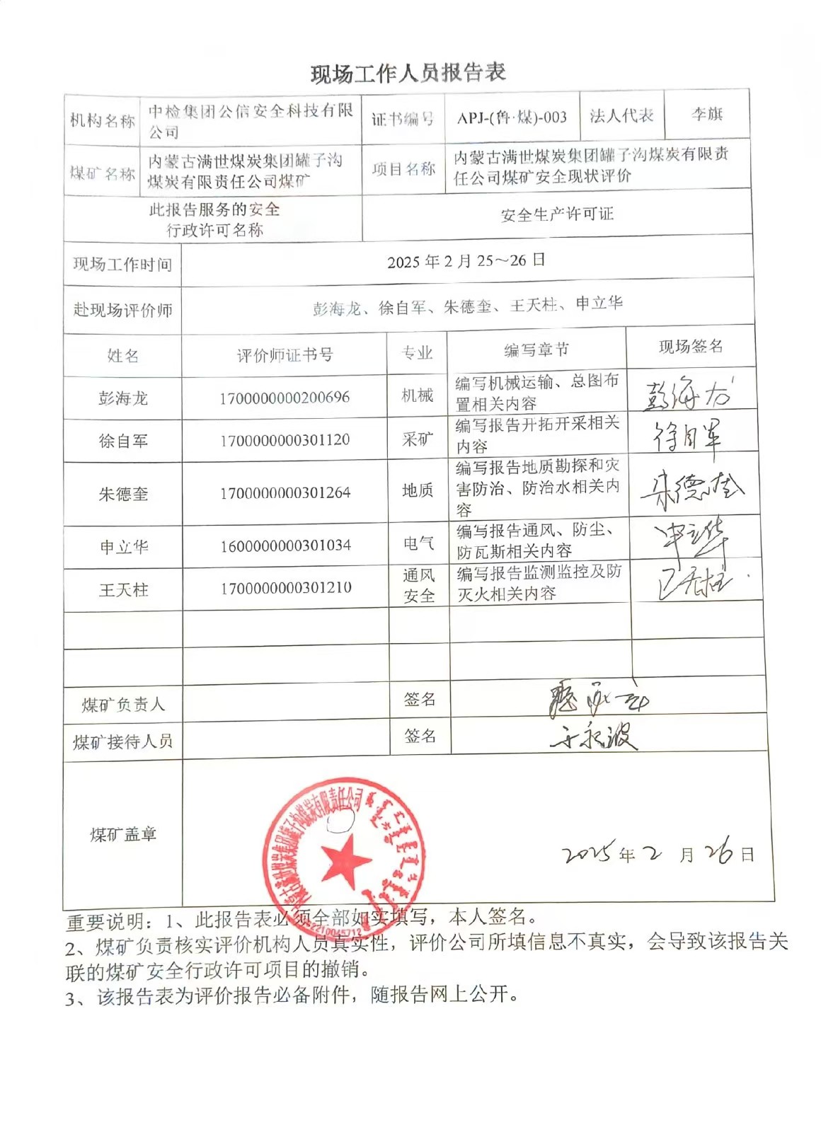 現(xiàn)場開展安全評價工作的人員、時間及主要任務(wù): 彭海龍 王天柱 申立華 朱德奎 徐自軍于2025年2月25~26日到現(xiàn)場進行調(diào)查、搜集資料,進行現(xiàn)場評價。 彭海龍 朱德奎、徐自軍于2025年5月19日對現(xiàn)場問題進行復(fù)查,礦方均已整改合格。 彭海龍 王天柱 申立華 朱德奎 徐自軍 王兆亮 劉超對報告進行了編寫。 | |||||||