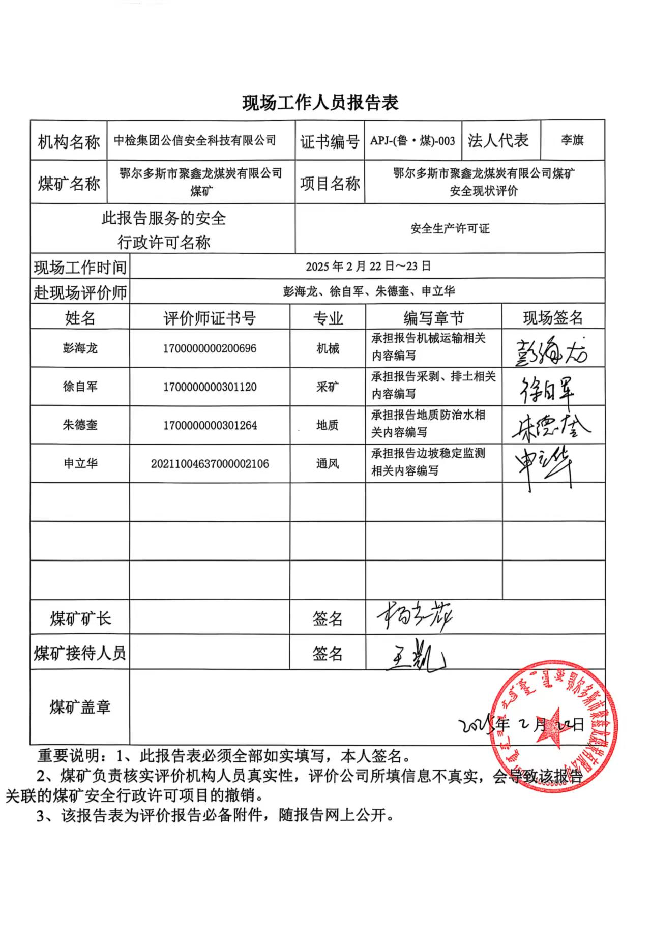 現(xiàn)場開展安全評(píng)價(jià)工作的人員、時(shí)間及主要任務(wù): 彭海龍、徐自軍、朱德奎、申立華于2025年2月22~23日到現(xiàn)場進(jìn)行調(diào)查、收集資料,進(jìn)行現(xiàn)場評(píng)價(jià)。 彭海龍、朱德奎、申立華于2025年6月7日對(duì)現(xiàn)場問題進(jìn)行復(fù)查,礦方均已整改合格。 彭海龍、徐自軍、朱德奎、王兆亮、王天柱、申立華、劉超,對(duì)報(bào)告進(jìn)行了編寫。 | |||||||