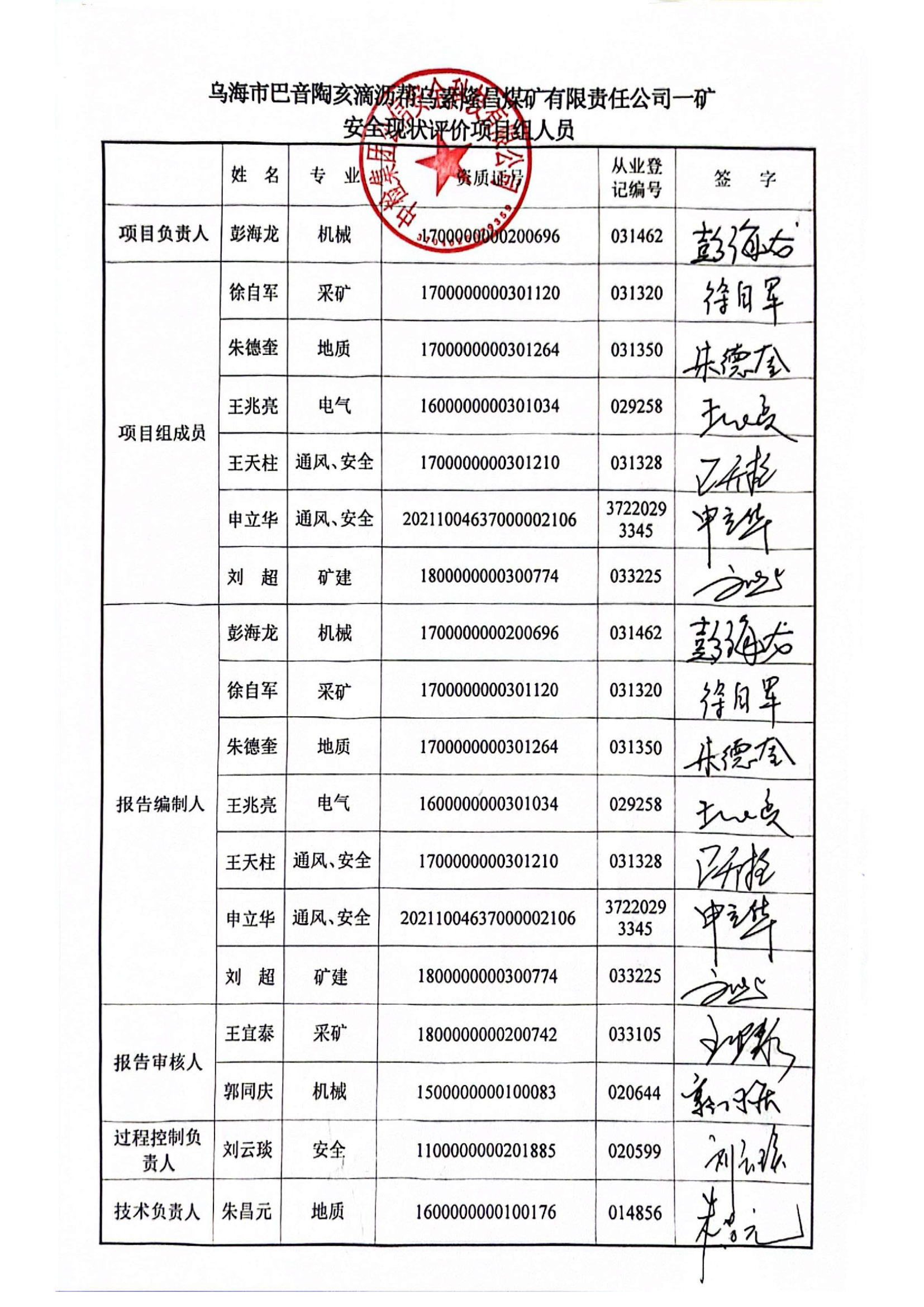 現場開展安全評價工作的人員、時間及主要任務: 彭海龍 徐自軍 朱德奎 申立華 于2025年3月7日到現場進行調查、搜集資料,進行現場評價。 于2025年3月9日到現場評價時存在的問題進行了復查。 2025年4月15日,烏海市應急管理局組織專家對隆昌煤礦進行了安全生產許可證發(fā)證現場核查,按照核查要求對報告內容進行了修改,出具此版《烏海市巴音陶亥滴瀝幫烏素隆昌煤礦有限責任公司一礦安全現狀評價報告》。 | |||||||