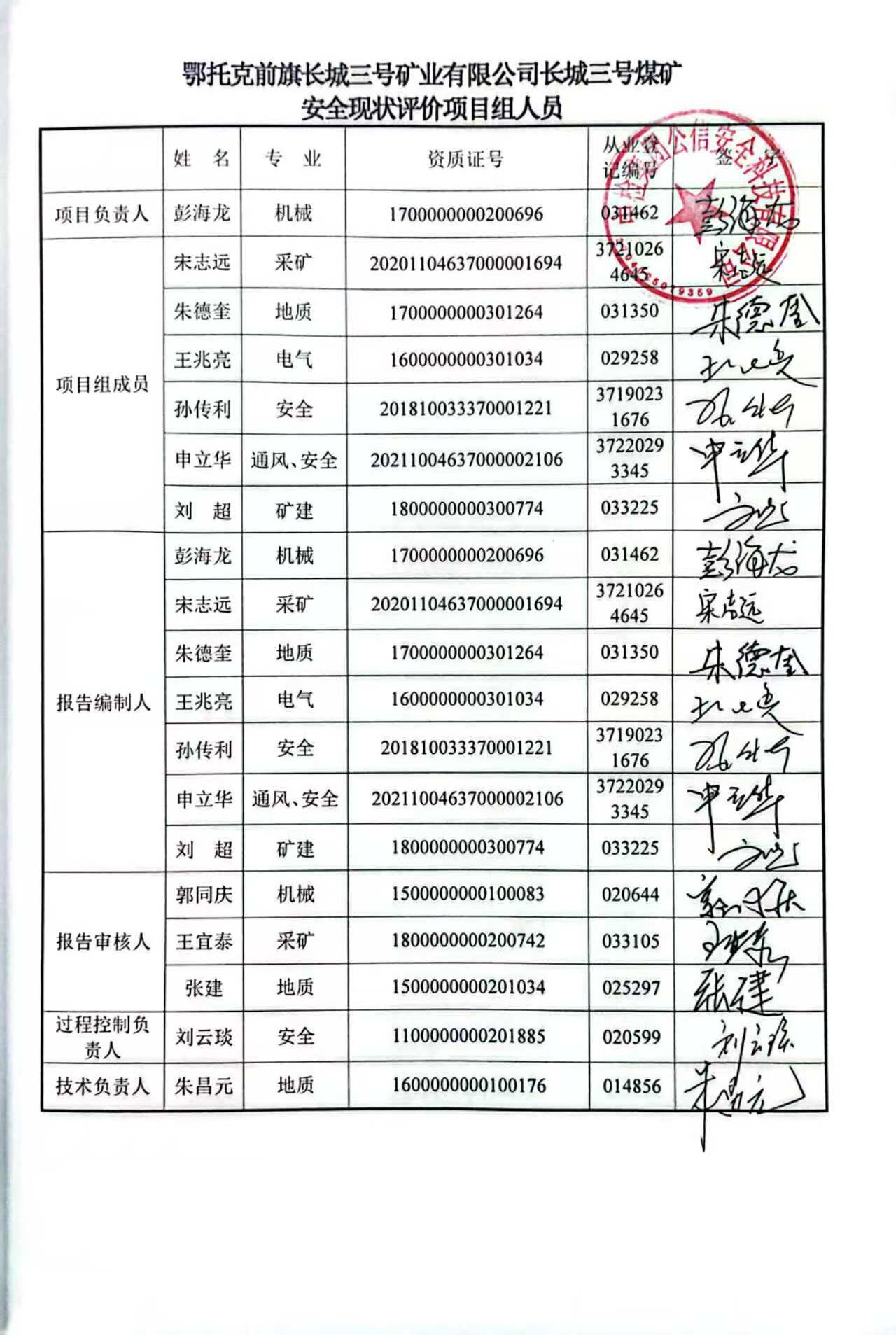 參與安全評(píng)價(jià)工作的注冊(cè)安全工程師: 彭海龍 孫傳利 申立華 朱德奎 宋志遠(yuǎn) 王兆亮 | |||||||