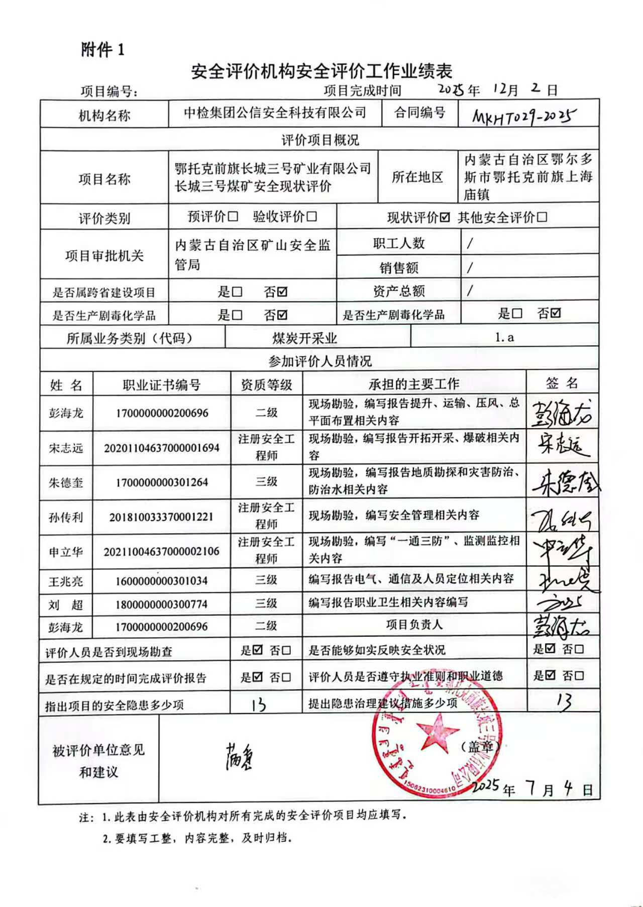 現(xiàn)場(chǎng)開(kāi)展安全評(píng)價(jià)工作的人員、時(shí)間及主要任務(wù): 彭海龍 孫傳利 申立華 朱德奎 宋志遠(yuǎn)于2025年7月3日~4日到現(xiàn)場(chǎng)進(jìn)行調(diào)查、搜集資料,進(jìn)行現(xiàn)場(chǎng)評(píng)價(jià)。 彭海龍 宋志遠(yuǎn)于2025年7月6日對(duì)現(xiàn)場(chǎng)問(wèn)題進(jìn)行復(fù)查,礦方均已整改合格。 彭海龍 孫傳利 申立華 朱德奎 宋志遠(yuǎn) 王兆亮 劉超 對(duì)報(bào)告進(jìn)行了編寫(xiě)。 | |||||||