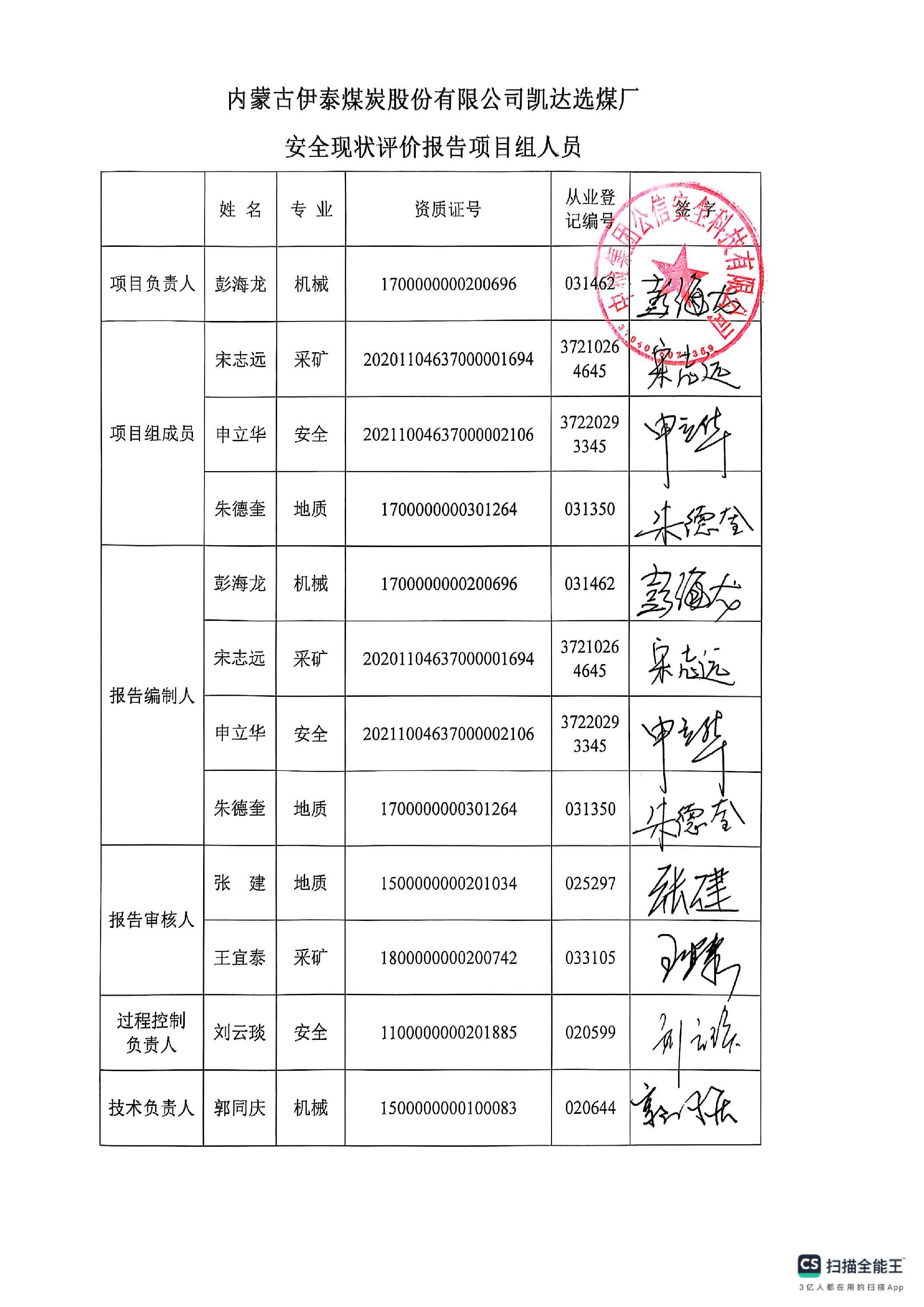 參與安全評價工作的安全評價師: 彭海龍 申立華 朱德奎 宋志遠 | |||||||