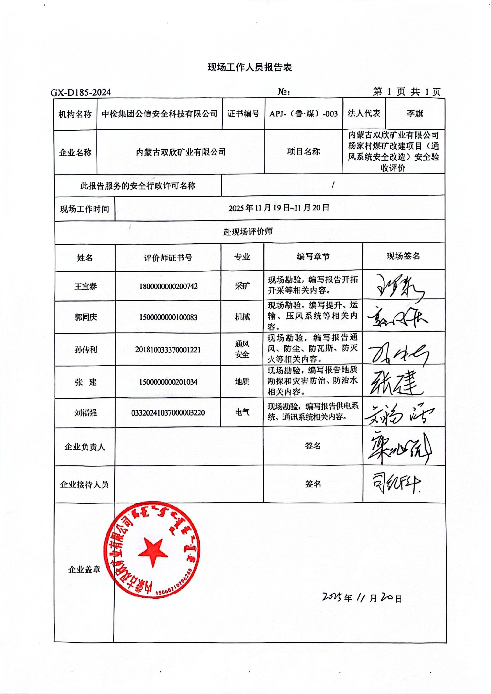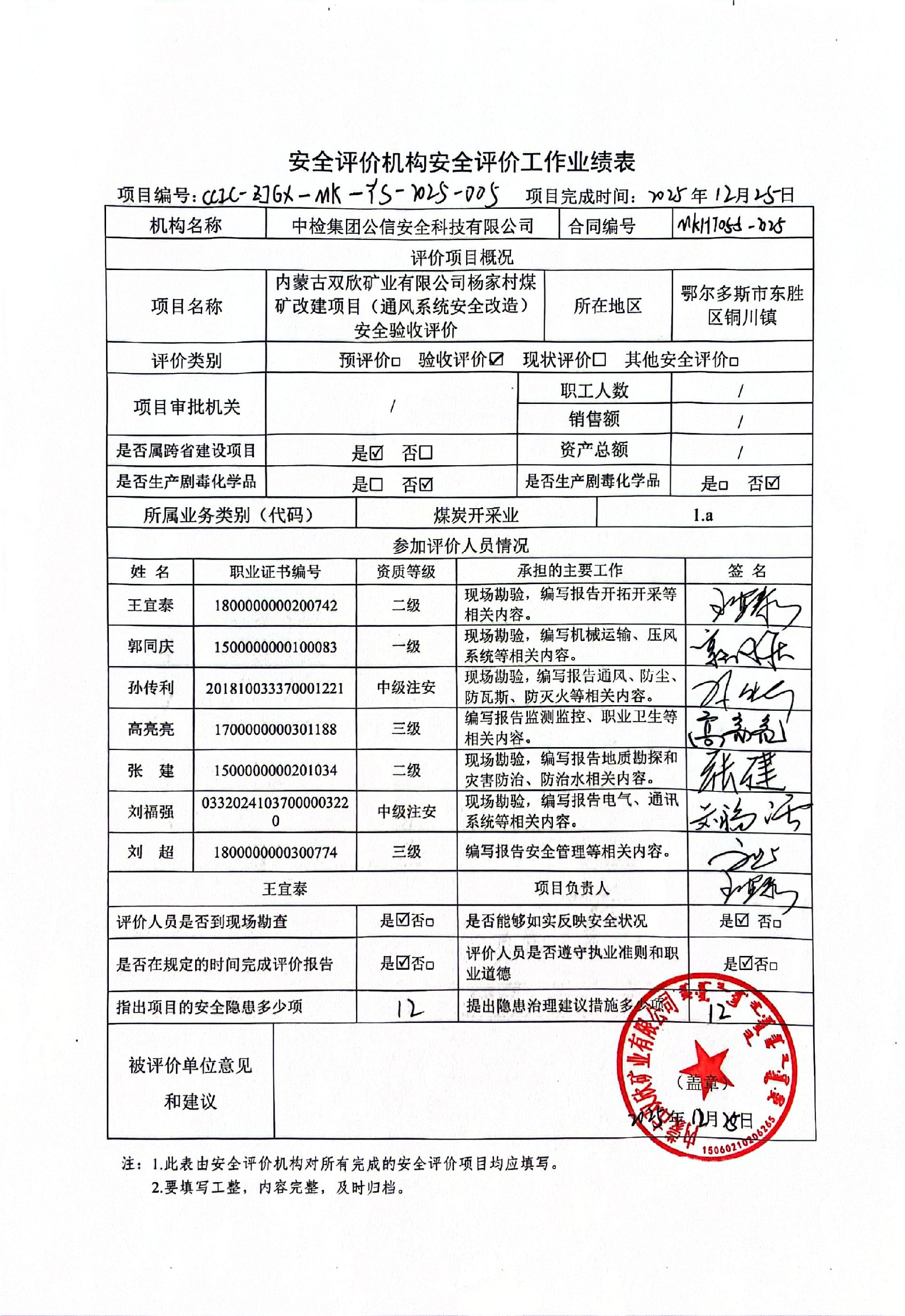 評(píng)價(jià)項(xiàng)目簡(jiǎn)介: 內(nèi)蒙古雙欣礦業(yè)有限公司是由原淄博礦業(yè)集團(tuán)有限責(zé)任公司與內(nèi)蒙古雙欣能源化工有限公司合資組建,并于2006年7月注冊(cè)成立,其中原淄博礦業(yè)集團(tuán)有限責(zé)任公司(山東能源集團(tuán)西北礦業(yè)有限公司由兗礦能源集團(tuán)股份有限公司和淄博礦業(yè)集團(tuán)有限責(zé)任公司共同持股)出資55%控股。內(nèi)蒙古雙欣礦業(yè)有限公司楊家村煤礦位于內(nèi)蒙古自治區(qū)鄂爾多斯市境內(nèi),行政區(qū)劃隸屬鄂爾多斯市東勝區(qū)銅川鎮(zhèn)管轄。 內(nèi)蒙古雙欣礦業(yè)有限公司楊家村煤礦于2008年11月6日開(kāi)工建設(shè),2011年3月主體工程竣工,2011年5月進(jìn)行試生產(chǎn),2011年12月通過(guò)安全設(shè)施及條件竣工驗(yàn)收,設(shè)計(jì)生產(chǎn)能力5.00Mt/a。為解決礦井后續(xù)長(zhǎng)期不達(dá)產(chǎn)問(wèn)題,礦井需布置2個(gè)盤(pán)區(qū)同時(shí)生產(chǎn),實(shí)現(xiàn)薄厚煤層搭配開(kāi)采,同時(shí)為降低礦井已有回風(fēng)立井風(fēng)速并實(shí)現(xiàn)分區(qū)式通風(fēng),礦井進(jìn)行通風(fēng)系統(tǒng)安全改造(新建2#回風(fēng)立井);2022年9月1日開(kāi)工建設(shè),2025年10月30日建設(shè)完成;2025年11月5日開(kāi)始聯(lián)合試運(yùn)轉(zhuǎn),正常供風(fēng)。目前正在聯(lián)合試運(yùn)轉(zhuǎn)階段,暫未驗(yàn)收。鄂爾多斯市能源局于2023年9月8日,以《鄂爾多斯市能源局關(guān)于內(nèi)蒙古雙欣礦業(yè)有限責(zé)任公司楊家村煤礦生產(chǎn)能力等要素信息的公告》公告其生產(chǎn)能力核增至6.00Mt/a。 內(nèi)蒙古煤礦設(shè)計(jì)研究院有限責(zé)任公司于2025年6月編制完成了《內(nèi)蒙古雙欣礦業(yè)有限公司楊家村煤礦改建項(xiàng)目(通風(fēng)系統(tǒng)安全改造)安全設(shè)施設(shè)計(jì)》,由內(nèi)蒙古自治區(qū)礦山安全監(jiān)管局進(jìn)行批復(fù),并于2025年7月16日出具了《內(nèi)蒙古自治區(qū)礦山安全監(jiān)管局關(guān)于內(nèi)蒙古雙欣礦業(yè)有限公司楊家村煤礦改建項(xiàng)目(通風(fēng)系統(tǒng)安全改造)安全設(shè)施設(shè)計(jì)的批復(fù)》(內(nèi)礦安函〔2025〕336號(hào));內(nèi)蒙古煤礦設(shè)計(jì)研究院有限責(zé)任公司于2025年7月編制完成了《內(nèi)蒙古雙欣礦業(yè)有限公司楊家村煤礦改建項(xiàng)目(通風(fēng)系統(tǒng)安全改造)初步設(shè)計(jì)》,由鄂爾多斯市能源局進(jìn)行批復(fù),并于2025年7月18日出具了《鄂爾多斯市能源局關(guān)于內(nèi)蒙古雙欣礦業(yè)有限公司楊家村煤礦改建項(xiàng)目(通風(fēng)系統(tǒng)安全改造)初步設(shè)計(jì)的批復(fù)》(鄂能局審批發(fā)〔2025〕44號(hào))。 | ||||||