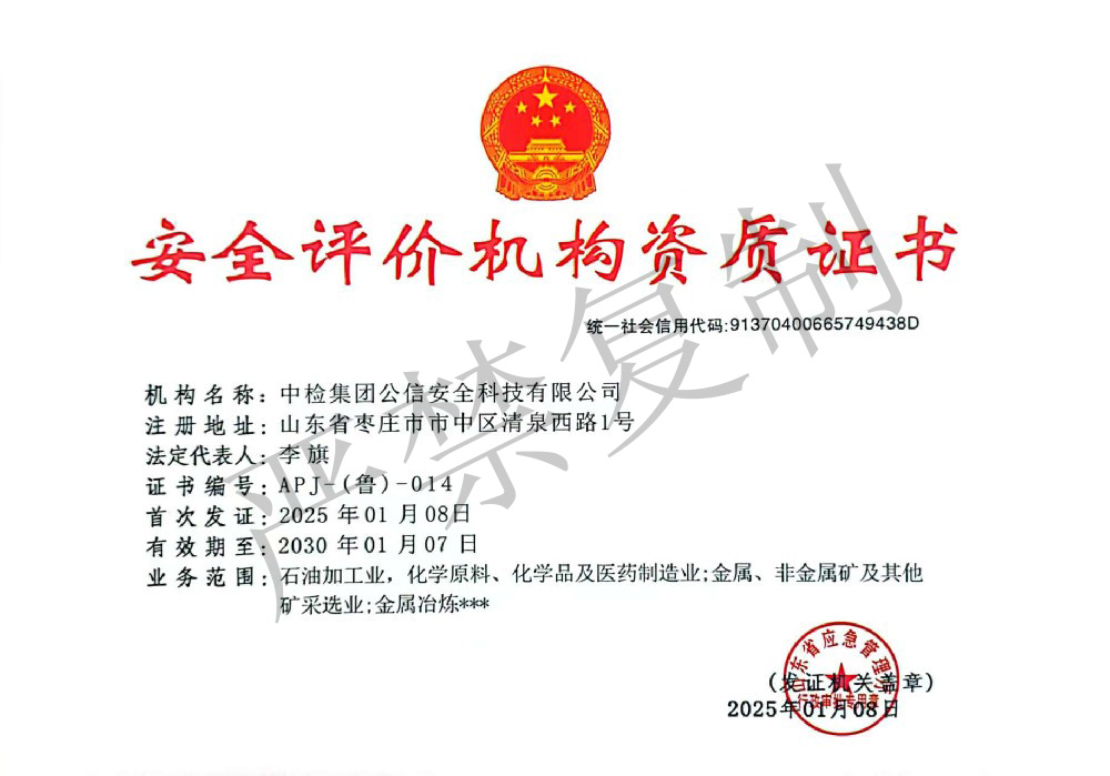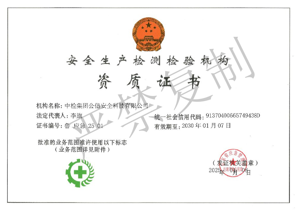 機構名稱:中檢集團公信安全科技有限公司證書編號:魯 應急 25 01有效期至:2030年01月07日
