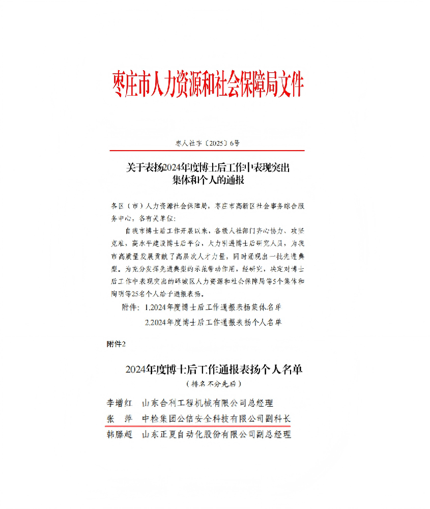 近日,棗莊市人力資源和社會(huì)保障局印發(fā)《關(guān)于表?yè)P(yáng)2024年度博士后工作中表現(xiàn)突出集體和個(gè)人的通報(bào)》,中檢集團(tuán)公信安全科技有限公司(簡(jiǎn)稱“中檢公信”或“公司”)人力資源部張萍名列其中,榮獲···