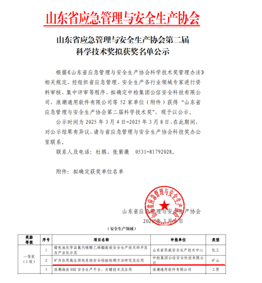 喜訊!中檢公信科技成果榮獲山東省應(yīng)急管理 與安全生產(chǎn)協(xié)會(huì)“科學(xué)技術(shù)獎(jiǎng)一等獎(jiǎng)”