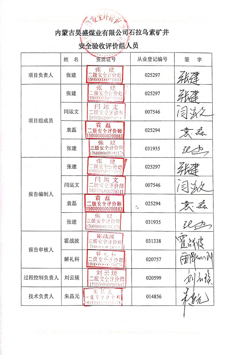 | 參與安全評價工作的安全評價師: 張 建 閆運文 袁 磊 張 建 |