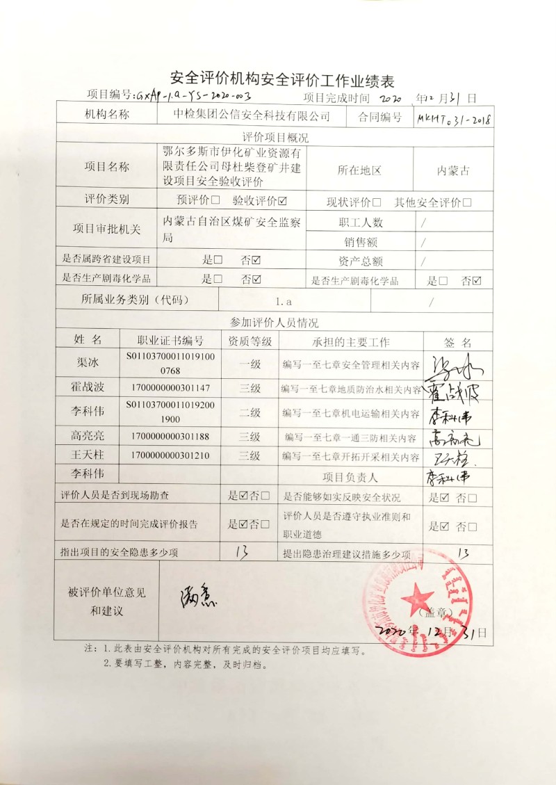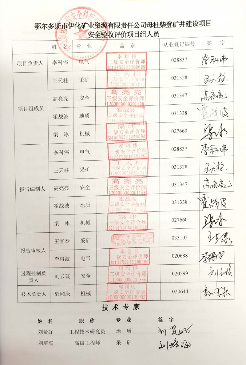 | 評價項目名稱 | 鄂爾多斯市伊化礦業(yè)資源有限責任公司母杜柴登礦井建設項目安全驗收評價報告 | ||||||