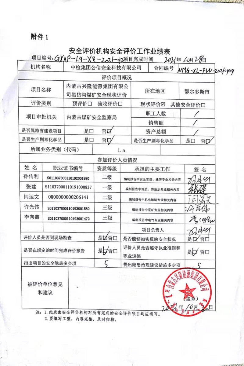 | 評(píng)價(jià)項(xiàng)目名稱 | 內(nèi)蒙古興隆能源集團(tuán)有限公司黑岱溝煤礦安全現(xiàn)狀評(píng)價(jià) | ||||||